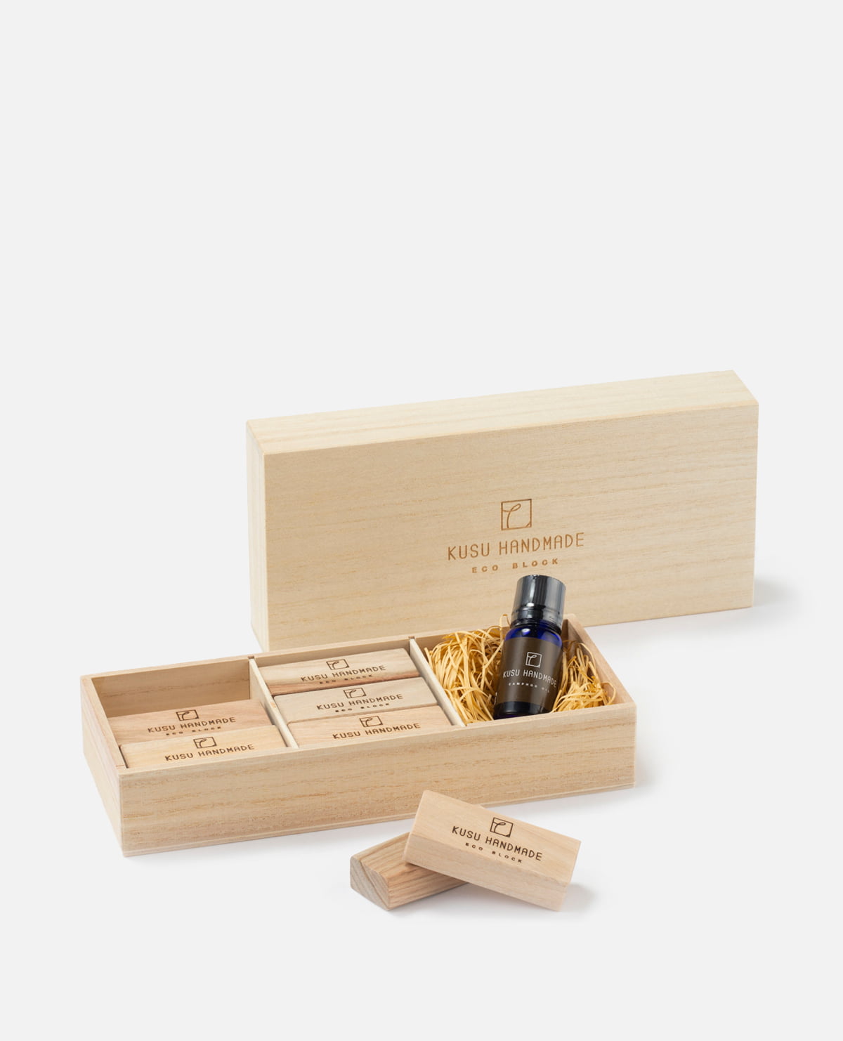 九州産の楠の端材を再利用し、天然の防虫・消臭効果のあるエコブロックや楠オイル等を製造。自然の恵みを循環させた、暮らしに役立つ香りのアイテムがそろう。
