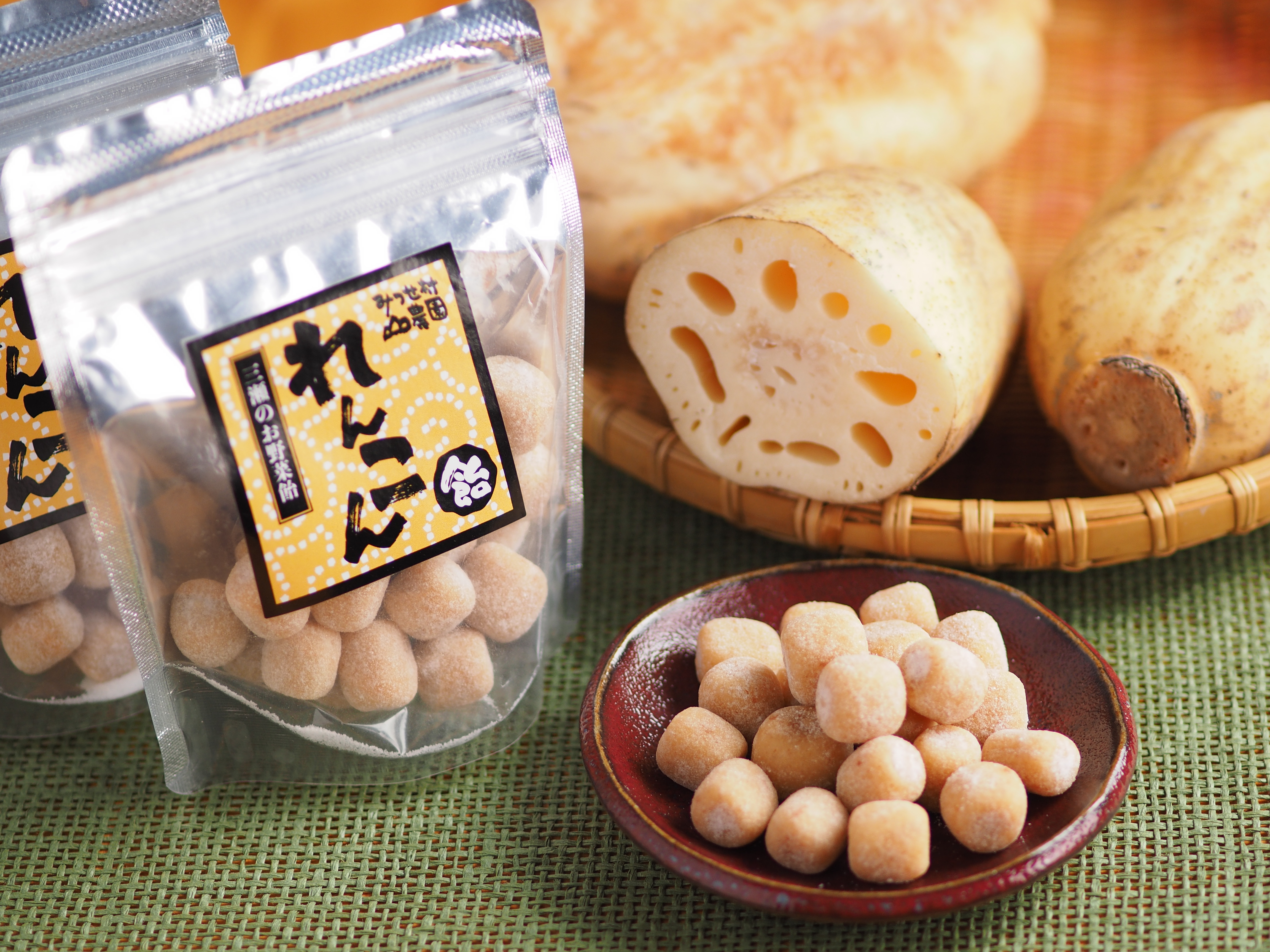 栄養豊富な佐賀県白石産のレンコンをもっと手軽に召し上がれるように、当社のヒット商品「れんこんパウダー」に蜂蜜を練り込んだ飴です。