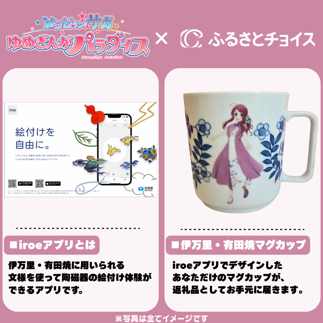iroeアプリ上で、ゾンビランドサガのオリジナル描き下ろしキャラクターと、伝統的な伊万里・有田焼の文様を自由に組み合わせてデザインできる企画です。完成したデザインをもとに、キャラクター部分はプリント転写で、文様部分は伝統工芸士が手描きで再現。限定100個の返礼品となっています。