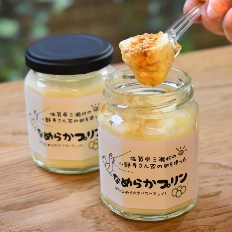 商品説明:佐賀県三瀬の小野寺さんちの卵を使用し、生クリームをたっぷりと入れた、口に入れたらなめらかな食感の無添加プリンです。カラメル、塩、きなこはお好みでおかけください。