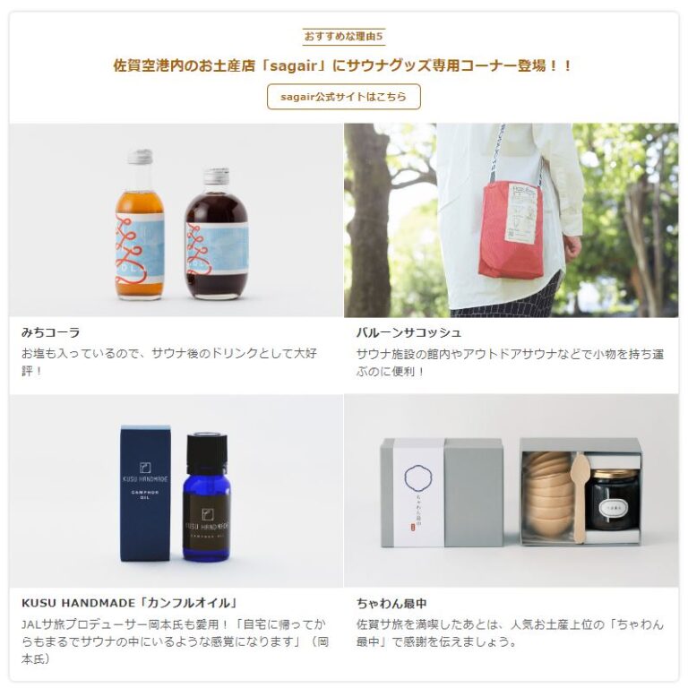このご当地サウナ委員会の新企画「スプリング・ジャパン 成田ー佐賀間「サウナ路線」宣言!」の特設ページにて、九州佐賀国際空港のお土産店「sagair」が紹介されています。