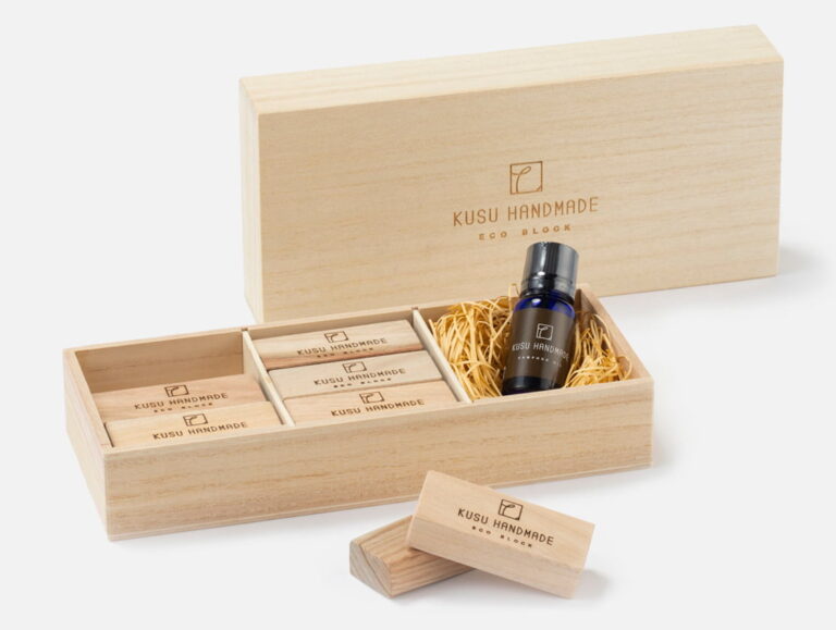 九州産の楠の端材を再利用し、天然の防虫・消臭効果のあるエコブロックや楠オイル等を製造。自然の恵みを循環させた、暮らしに役立つ香りのアイテムがそろう。