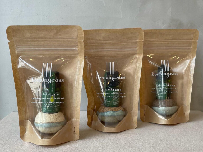 商品説明:オーガニック栽培のレモングラスオイル100%で精製したエッセンシャルオイルと、武雄焼「東馬窯」のレモングラス釉薬を使ったアロマストーンのセット。