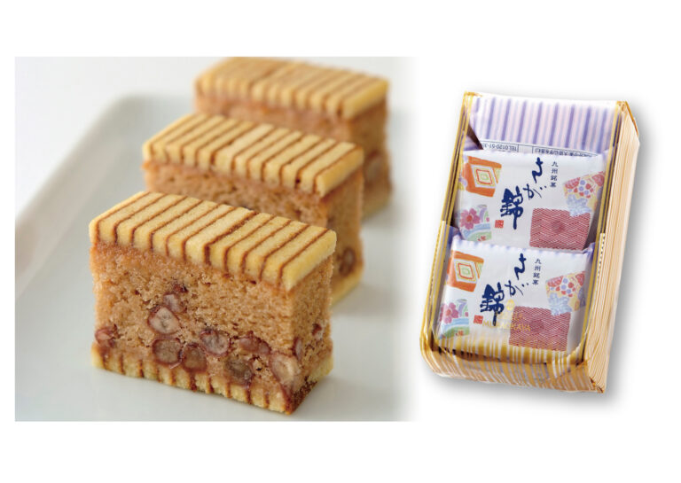 カステラにあわせて選んだ村岡総本舗の自家製餡と羊羹をカステラの間に挟み5層にすることで、より柔らかな食感と香りの広がりを楽しむことができます。