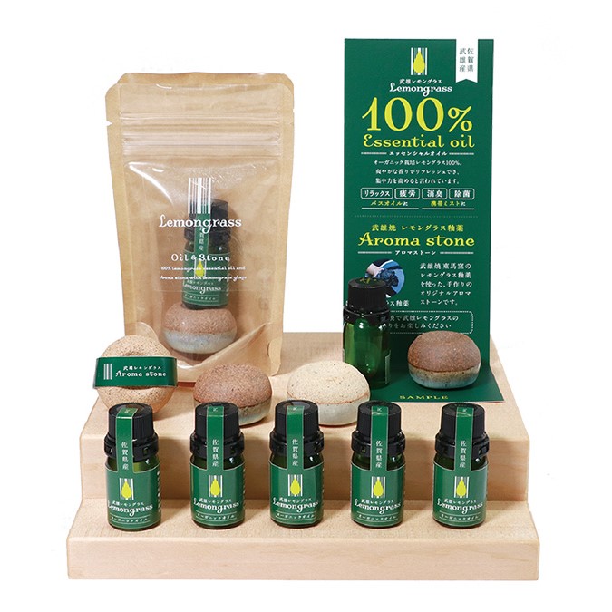 オーガニック栽培のレモングラス100%で精製したエッセンシャルオイルと、武雄焼「東馬窯」のレモングラス釉薬を使ったオリジナルアロマストーンのセットです。