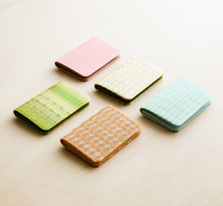 金、銀、漆箔などを貼って細く切った和紙をタテ糸にし、竹のヘラで拾いながら絹の細い糸を織りこみ、網代(あじろ)や紗綾(さや)型、菱形など多種多様な模様を手仕事で織り上げます。
