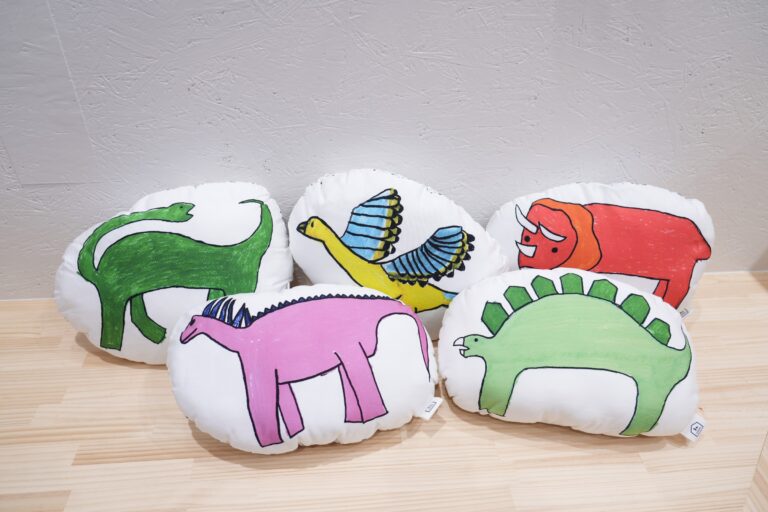 GENIUSのアーティスト馬場美鈴が描いた愛らしいタッチの恐竜5匹をオリジナルのクッションにしました。