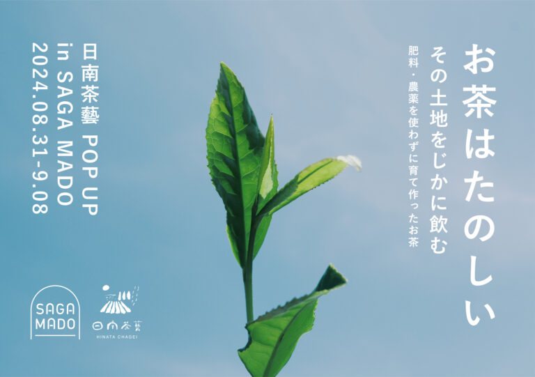 さが県産品流通デザイン公社は、佐賀県の県産品を厳選したセレクトショップ「SAGA MADO」において、2024年8月31日(土曜日)から9月8日(日曜日)の9日間、伊万里市の茶農家「日南茶藝(ひなたちゃげい)」のPOP UPを開催します。
