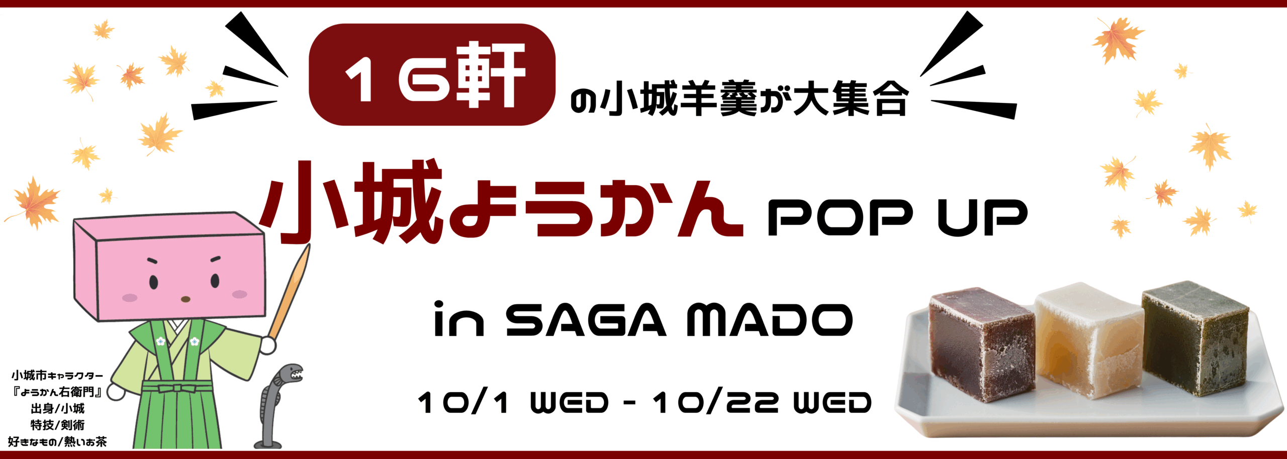 さが県産品流通デザイン公社(所在地:佐賀市、所長:石井法子)は、佐賀県の県産品を厳選したセレクトショップ「SAGA MADO」において、2025年10月1日(水曜日)~10月22日(水曜日)に、佐賀銘菓「小城羊羹(おぎようかん)」を集めた「小城羊羹 POP UP」を開催します。