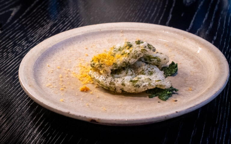 ・自然薯のゼッポリーニ、モロヘイヤ、カラスミ 1,500円