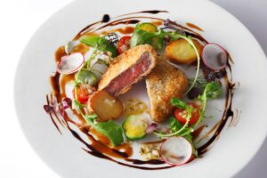 佐賀県産黒毛和牛を贅沢にカツレツにしました。自家製デミグラスソースと甘酸っぱいトマトのマリネとともにお召し上がりください。