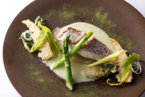 ♦「佐賀県産“穂州鯛”のポッシェ アスパラガスソース 春野菜のベニエ添え」 2,970円