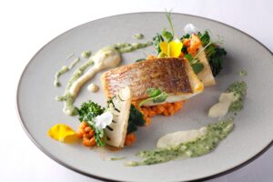 玄界灘の平スズキのポワレ 橙のビネグレット 春野菜添え