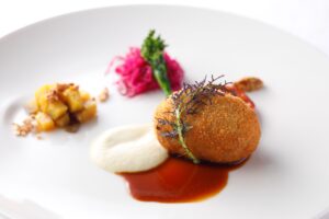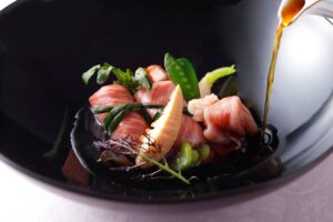 自然薯は低温でじっくり加熱して旨味とホクホク感を引き出し、れんこんはすりおろして火入れし、弾むような食感を楽しめるように調理しています。それぞれを丁寧に仕上げた後、甘味ときめ細かな霜降りが特長の「佐賀牛」サーロインで包み込みました。素材の風味を佐賀牛の濃厚な旨味とダブルコンソメが深くまとめ上げ、春の訪れを感じるひと皿に仕上げています。