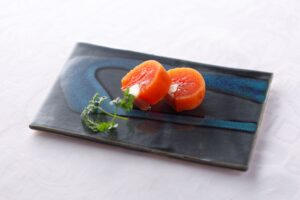 唐津焼のお皿で楽しむ佐賀県産“松梅”の干し柿 クリームチーズ、生ハムのマリアージュ