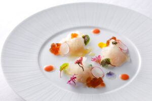 玄界灘の平目のカルパッチョ トマトのクーリーと鬼ジャンのジュレ
