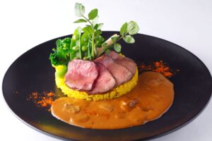 佐賀県産黒毛和牛のもも肉を低温でじっくりとローストして旨味を引き出し、サワークリームの酸味とコクを効かせたストロガノフ風ソースで仕上げました。香り高いサフランライスと春野菜を添えた、やさしい味わいのひと皿です。