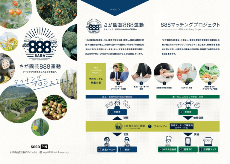 888マッチングプロジェクトは、「さが園芸888運動」と連動し、園芸生産者と実需者や消費者との懸け橋となるマッチングプロジェクトに取り組み、新規栽培面積拡大等に対応した販売先の確保(出口対策)、高単価での取引の推進を図る事業です。