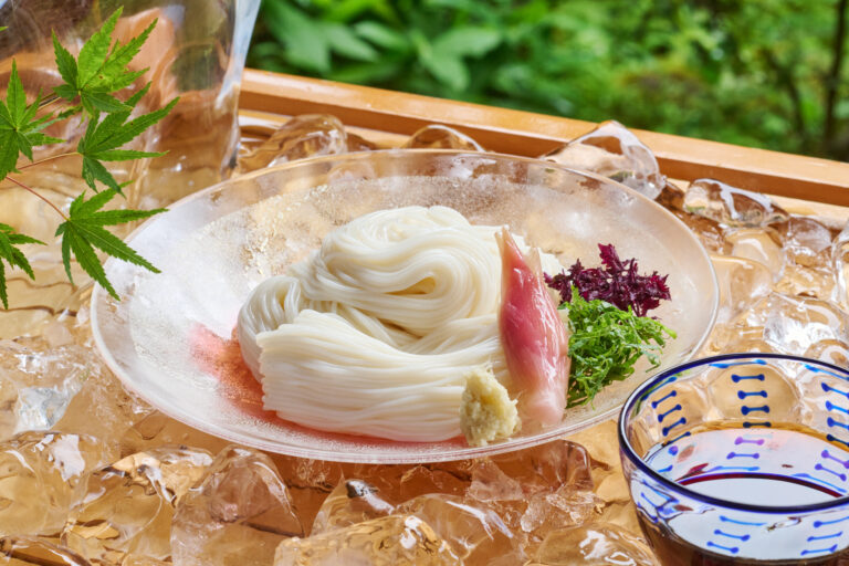 神埼市神埼町 は、国土交通省が選定する「水の郷百選」にも選ばれるほど清らかな水が豊富。さらに佐賀平野では良質な小麦が豊富に穫れることもあり、「神埼そうめん」は全国へと広まっていきました。また、機械そうめんの発祥地であり、ロール式の製麺機を開発し、いち早く導入したことでも知られています。シャキシャキとしたコシの強さに、ツルツルとしたのど越しの良さ。さらに、小麦の旨味と香りがしっかりと味わえる風味豊かな麺が特長です。冷製はもちろん、茹でても煮くずれしないため、にゅうめんにして食べるのもお勧めです。