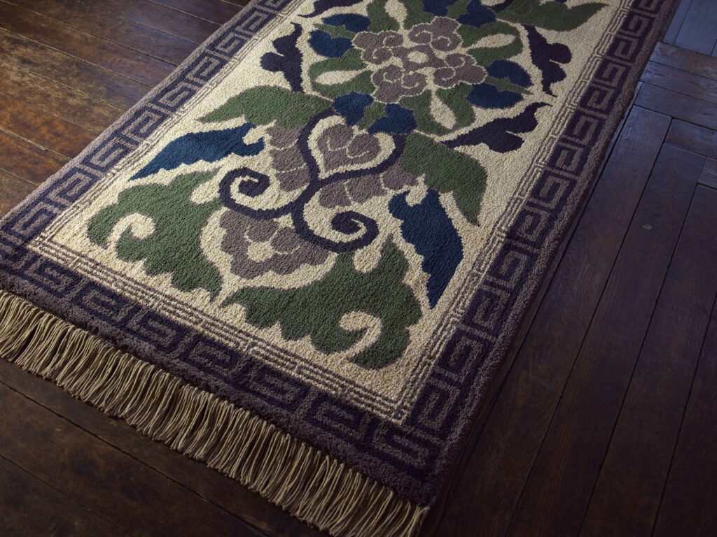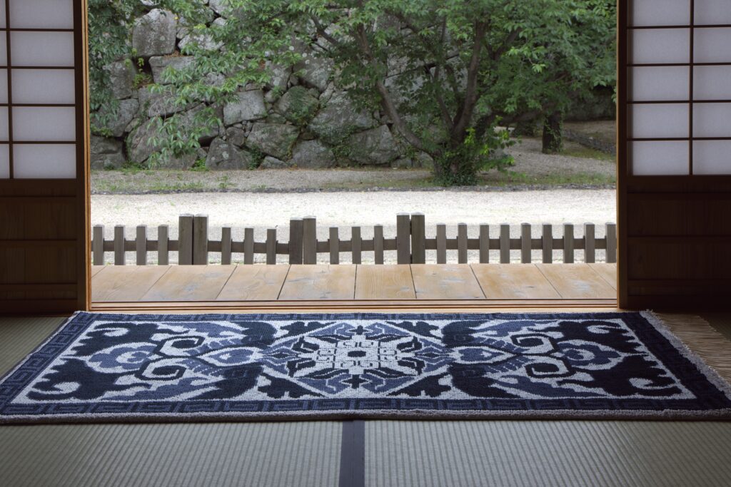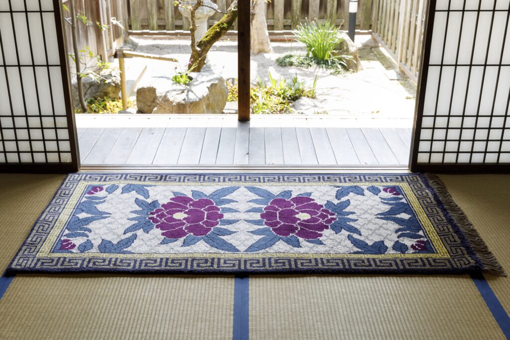 織糸には上質な木綿を使用しています。絹や羊毛などと比べると肌触りが良く、高温多湿な日本に適した敷物です。大胆かつ華やかな文様も魅力で、インテリアのアクセントになります。