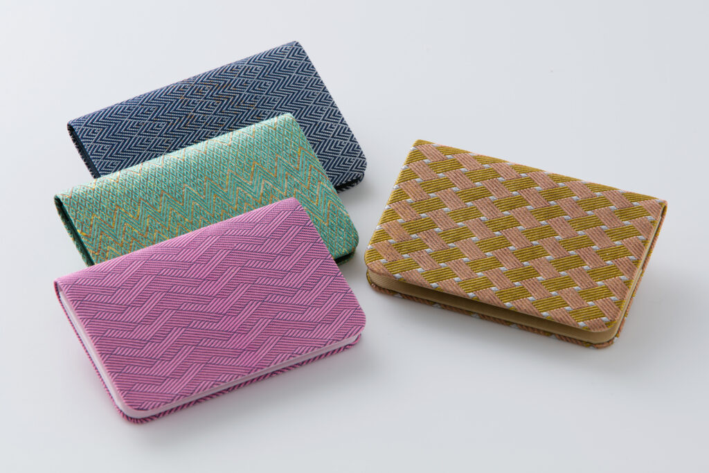 糸を通す道具に、緯糸を必要な分だけ巻き、織り出し(織り始め)と織り終わりに無地の平織りを織って経糸を定着させます。布を織り上げた後、必要な材料と織布を使って製品に仕上げます。