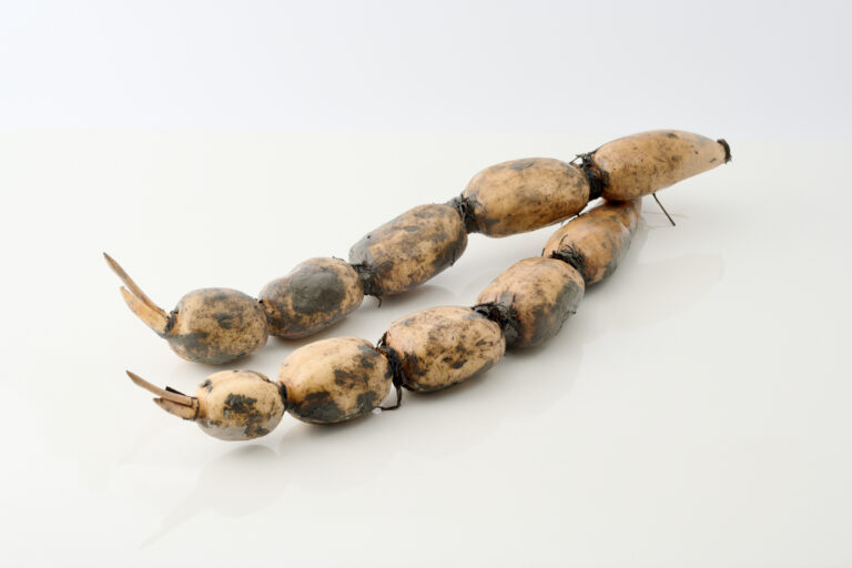 佐賀県のレンコンの品種は4〜5種類がメインで、その半分以上の出荷量を占めるのが「金澄(かなすみ)」。7月から9月頃の若いレンコンならではのシャキシャキとした食感が楽しめるのが特長です。出荷最盛期となる10月以降は、糸ひきが良く、モチモチ、ホクホクとした柔らかなレンコンが収穫されます。また、泥を付けて出荷される「泥付きレンコン」も佐賀県産の特長の一つ。水分と養分をたっぷり含んだ白石町のきめ細かな土が、光りや空気から守る保湿の役目を果たして日持ちを良くさせるため、掘り立てに近い状態での出荷を可能にしています。